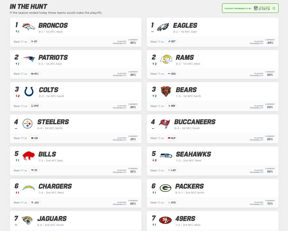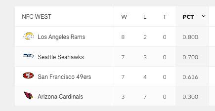 And check out the 49ers back in the playoff race! Seven teams make the playoffs in the NFC, and the 49ers are a half-game ahead of the Detroit Lions for that seventh spot. And notably, the 49ers are going into a Thanksgiving-month feast of lesser teams on which they should fatten themselves up.