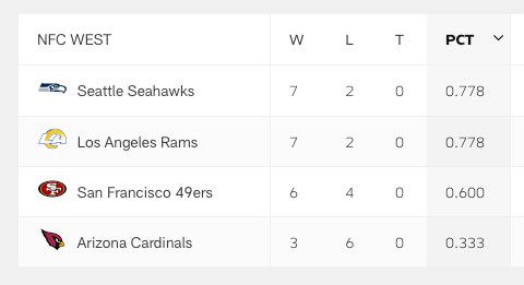 And so this morning, the 49ers find themselves a game-and-a-half behind both these Rams and the Seattle Seahawks in the NFC West race, after dominating the division for most of September and October. And the Seahawks are actually the current No 1 seed in the NFC? That’s fucked up.