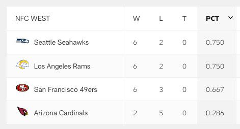 Great game and all, but the Seahawks and Rams both won on Sunday too. That leaves the 49ers still in the thick of the playoff race, but a half-game behind both Seattle and LA in the current NFC West standings.