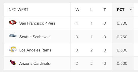 So that brings the 4-1 San Francisco 49ers into sole possession of first place in the NFC West division. Even if the second-place Seahawks beat the Tampa Bay Buccaneers on Sunday, the 49ers hold the tiebreaker based on their opening day win over the Seahawks. Moreover, the Niners are sitting pretty with a 3-0 division record, and wins over each of the other three NFC West teams.