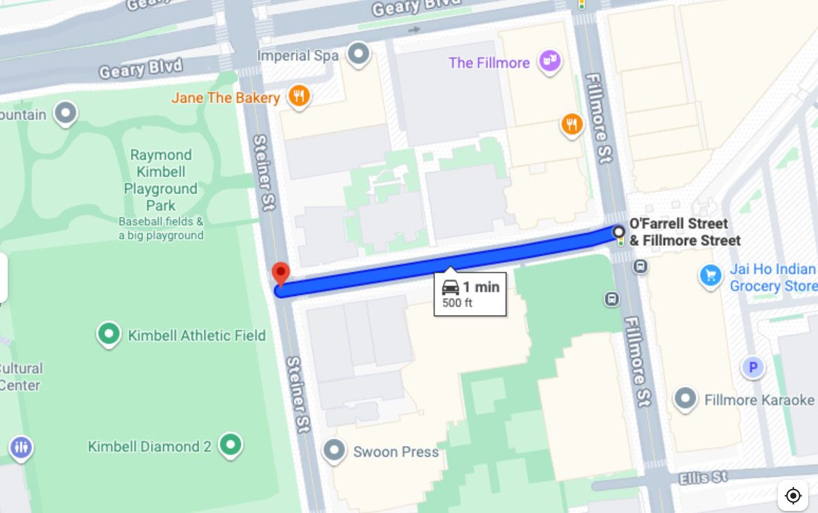 The supervisors did not approve making all of Fillmore Street a boozy entertainment zone. Instead, they approved to-go alcoholic drinks (and again, only when streets are shut down) on Fillmore between Sutter and McAlister streets, as seen above.