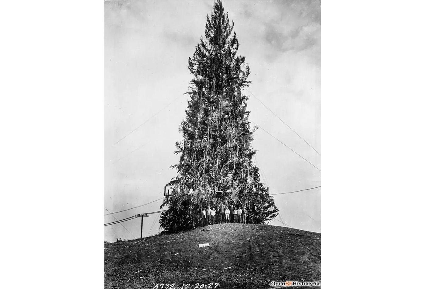 It is certainly a visible spot that would make for a festive tree installation, and that was the idea behind the original Christmas tree installed there in 1927, spearheaded by the city's former newspaper of record, the San Francisco Examiner. The Examiner announced its plans that year to install a tree on Twin Peaks, and as the Chronicle's Peter Hartlaub recounts for us this week, big-money interests and City Hall got involved, helping to fund the cutting down and transportation of a giant, 120-foot tree from Mendocino.