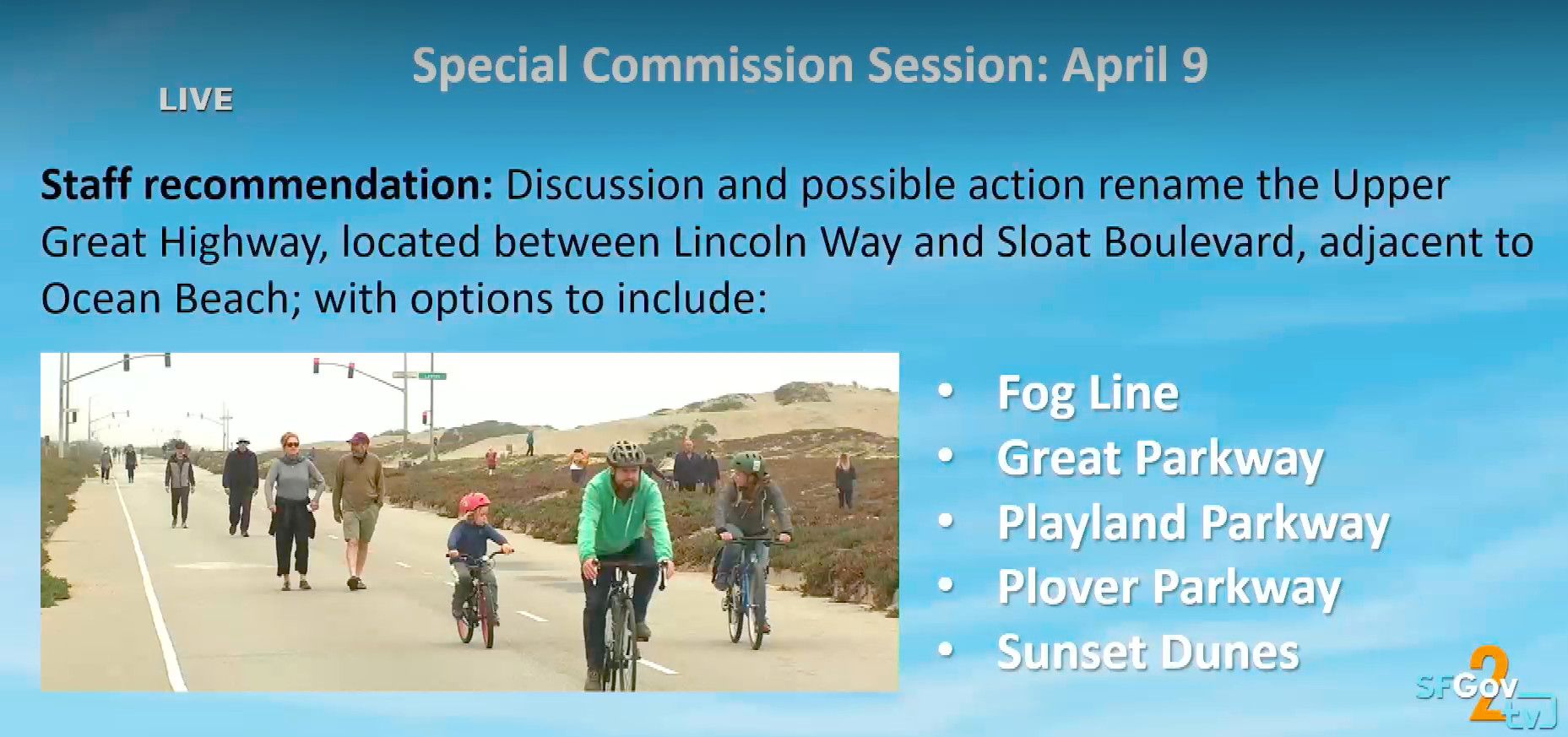 But there was strong commission support for Playland Parkway, a reference to the old-time amusement park Playland at the Beach that used to sit at the city’s western end. “Anyone that grew up in San Francisco in the 30s, 40s, 50s, and 60s had the opportunity to visit Playland at the Beach. And many, if not all, did,” Commissioner Joe Hallisy said. “Playland at the Beach was there before the Great Highway. The Great Highway came in in 1929, and Playland at the Beach started in 1926.”