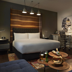 Each room includes one-of-a-kind tapestries and original pieces of art, not to mention all the streamlined smart tech you’d expect from a modern luxury boutique hotel. Hotel Zetta features a sleek and polished lobby that leads to a 24-hour fitness center along with a bar/restaurant that includes a playroom with a 30-foot-tall Plinko machine.