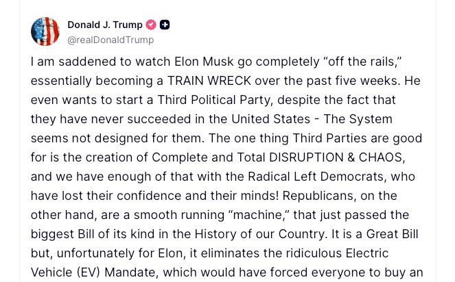 “I am saddened to watch Elon Musk go completely 'off the rails,' essentially becoming a TRAIN WRECK over the past five weeks,” Trump rambled on Truth Social. “He even wants to start a Third Political Party, despite the fact that they have never succeeded in the United States - The System seems not designed for them. The one thing Third Parties are good for is the creation of Complete and Total DISRUPTION & CHAOS, and we have enough of that with the Radical Left Democrats, who have lost their confidence and their minds!”