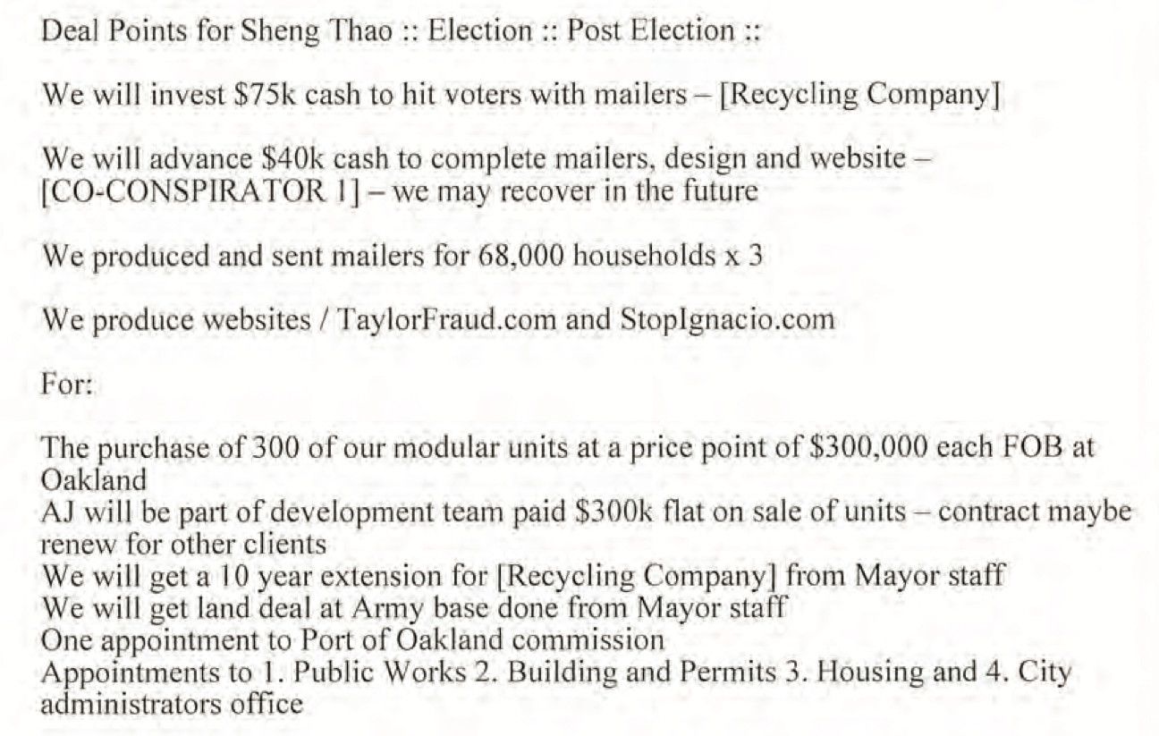 Mind you, Thao and Jones did not get their $3 million bribe, though they did ask for it. Jones did not even get the full $300,000 he was promised, and only got $95,000, as this modular home deal on the decommissioned Oakland Army Base fell through for still-unknown reasons.