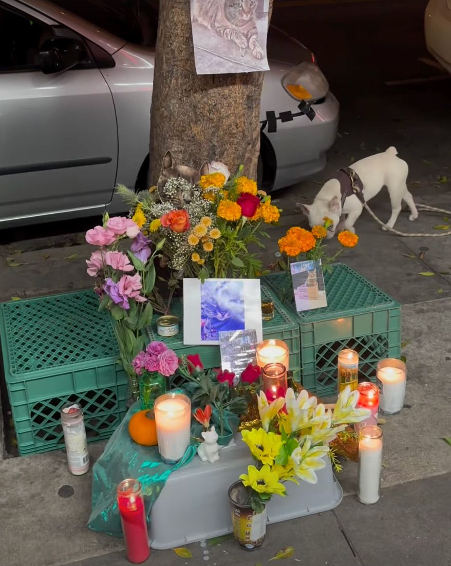 A memorial is growing on the sidewalk where KitKat would often sit, including flowers and at least one incendiary message: "Kill a Waymo! Save a Cat!"