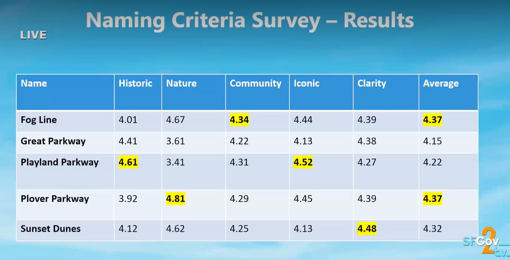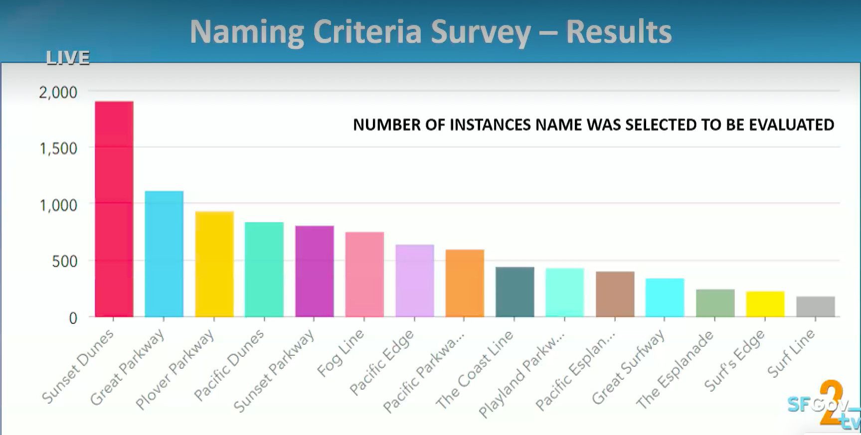 Sunset Dunes was by far the most popular name in the public Rec & Parks survey results, as seen above. It pulled nearly double the number of selections as the next-closest name Great Parkway.