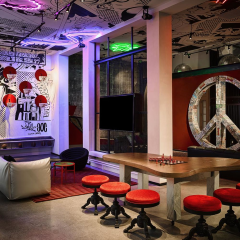 Each room includes one-of-a-kind tapestries and original pieces of art, not to mention all the streamlined smart tech you’d expect from a modern luxury boutique hotel. Hotel Zetta features a sleek and polished lobby that leads to a 24-hour fitness center along with a bar/restaurant that includes a playroom with a 30-foot-tall Plinko machine.