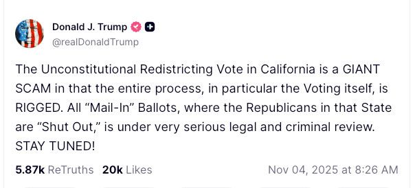 “The Unconstitutional Redistricting Vote in California is a GIANT SCAM in that the entire process, in particular the Voting itself, is RIGGED,” Trump posted. “All ‘Mail-In’ Ballots, where the Republicans in that State are ‘Shut Out,’ is under very serious legal and criminal review. STAY TUNED!”