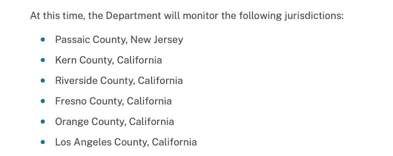 You’ll notice Newsom mentions New Jersey, which has a governor’s race election that same day. He mentions New Jersey because the Justice Department announcement singles out only five counties in the entire US that are getting election monitors. One of those counties is Passaic County, New Jersey, the other five are in California. (And of course, both New Jersey and California are blue states getting this unsolicited federal attention.)