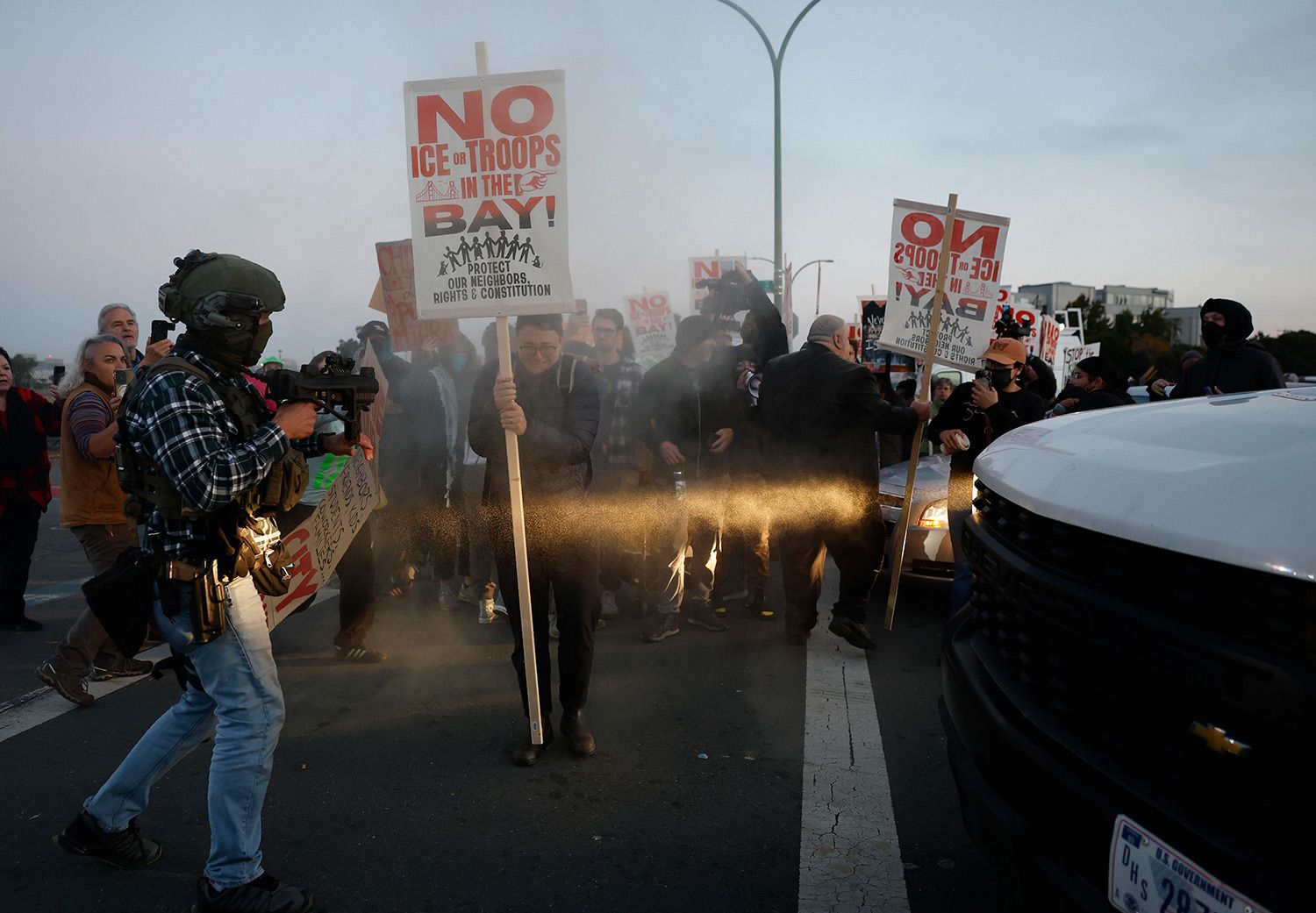 As the Chronicle reports, federal agents used "low-roll" stun grenades and pepper-spray balls to clear protesters from the gates, as vehicles were arriving their Thursday morning. One of the pepper-spray rounds struck a protester, local pastor Jorge Bautista in the chin, sending him to the emergency room.