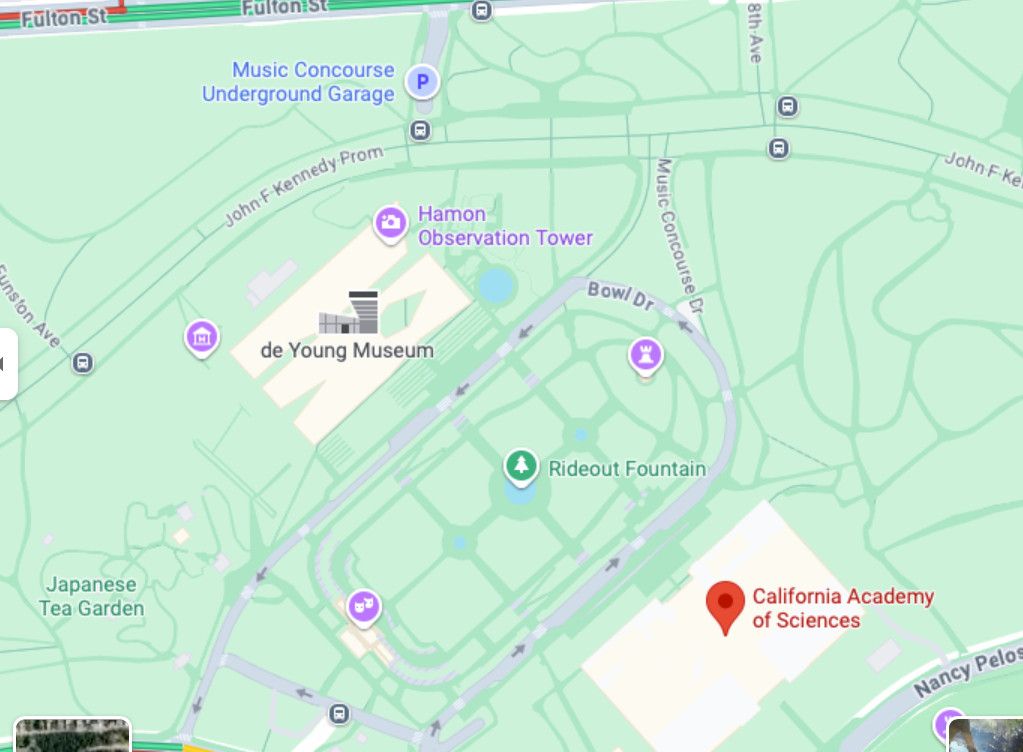 - The unnamed street between Music Concourse Drive and Hagiwara Tea Garden Drive (parallel to MLK Jr Drive)