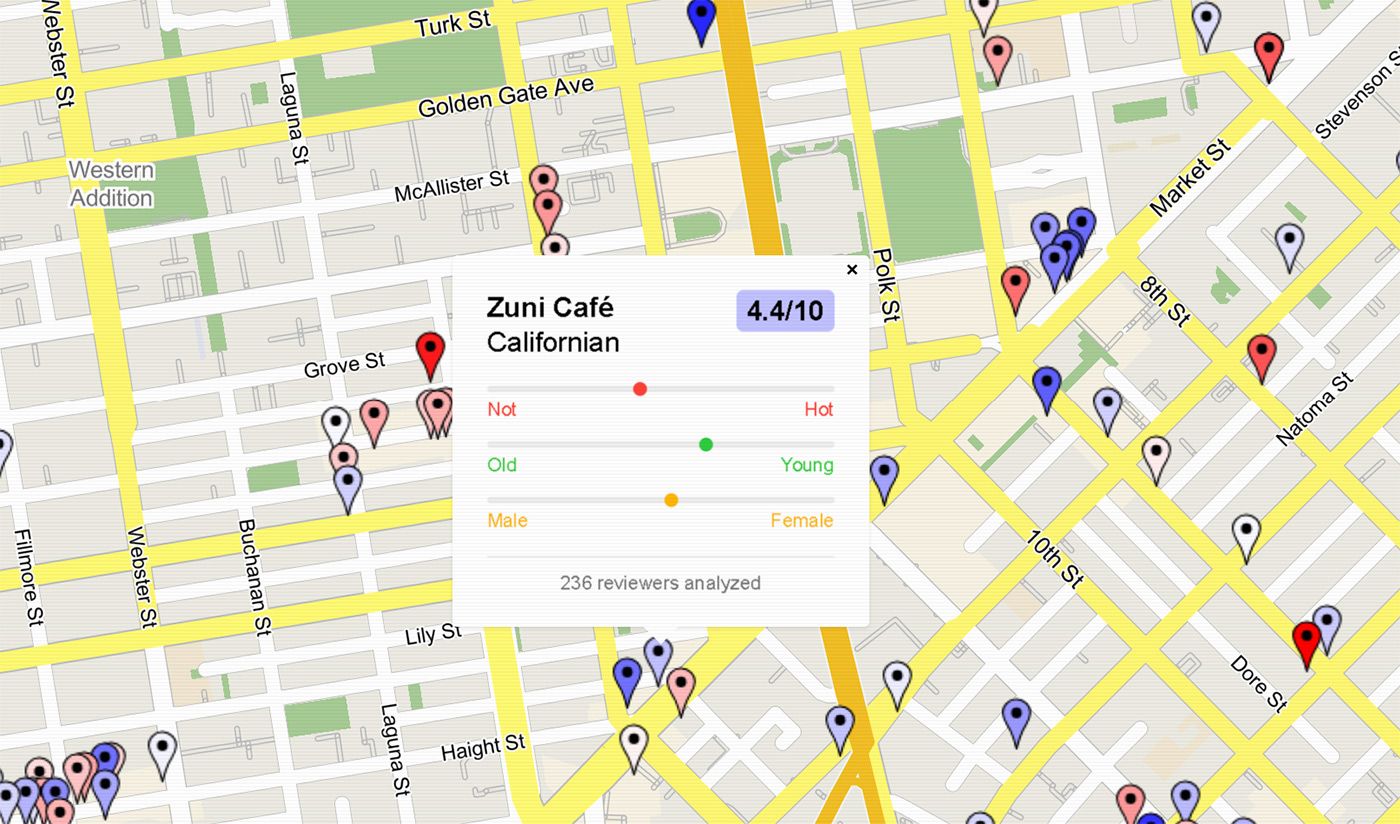 "I scraped millions of Google Maps restaurant reviews, and gave each reviewer's profile picture to an AI model that rates how hot they are out of 10," says San Francisco-based website creater Riley Walz. "This map shows how attractive each restaurant's clientele is. Red means hot, blue means not."