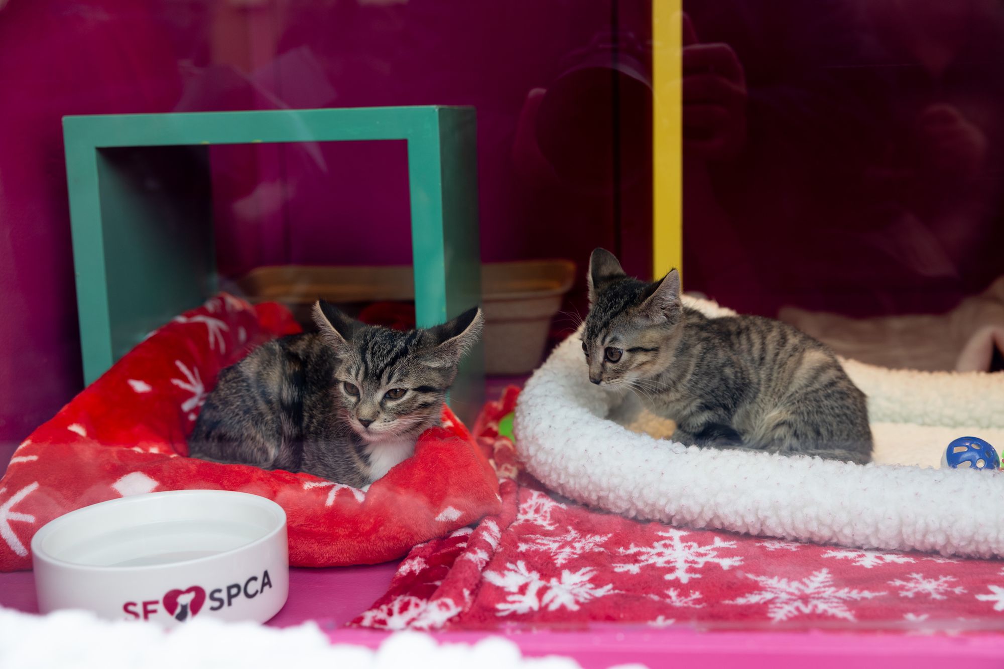 The five-and-a-half week holiday season window display is organized by the SF SPCA, who are in the business of finding homes for adoptable pets. And this year they’re running a special “Name Your Price” promotion in hopes of fostering as many adoptions as possible. (Though the puppies and kittens in the Macy’s window may not be a part of this promotion, as the SF SPCA says the Name Your Price deal is for “for all animals over 5 months old throughout the entire holiday period,” and the window animals may fall under that age range.)